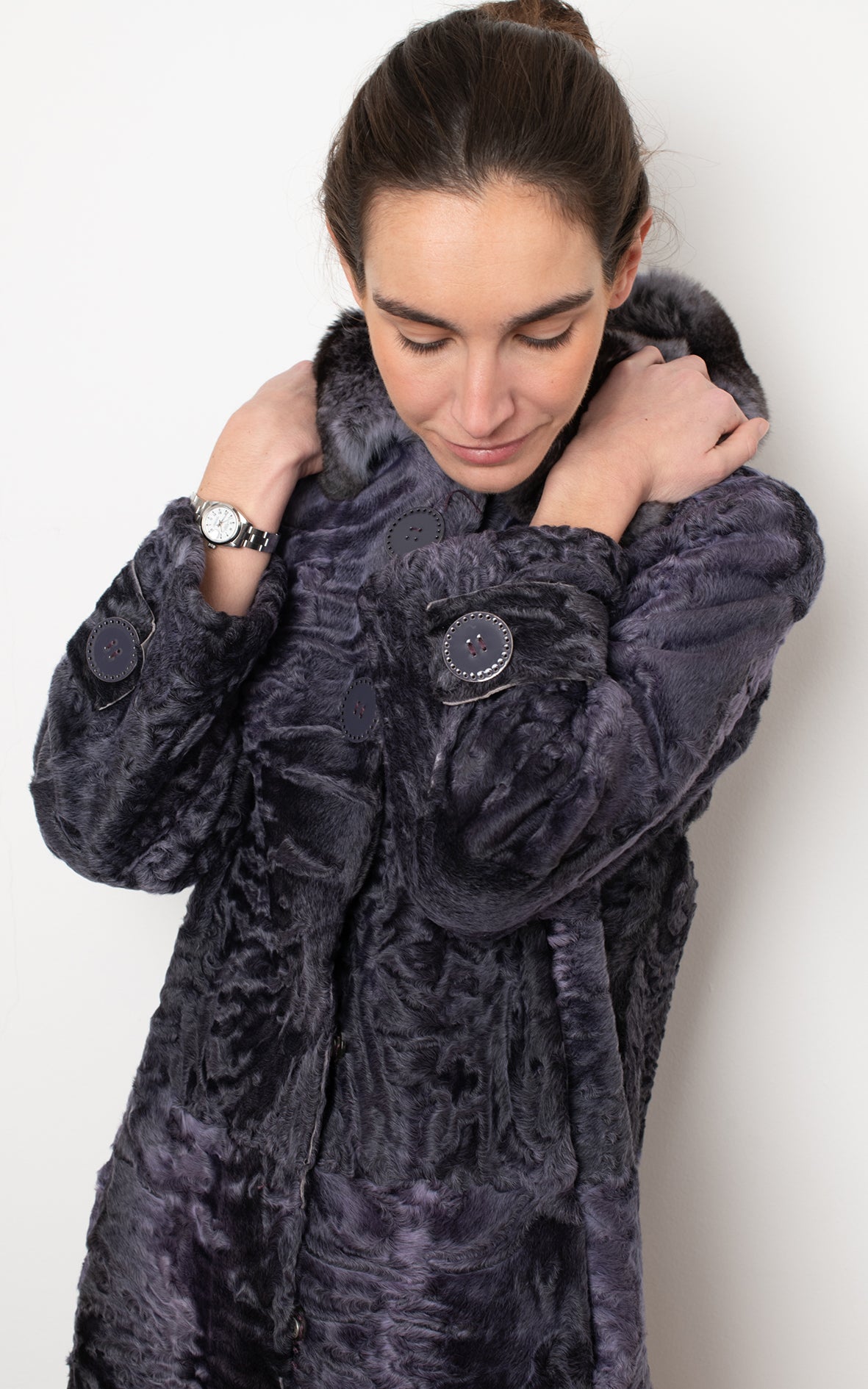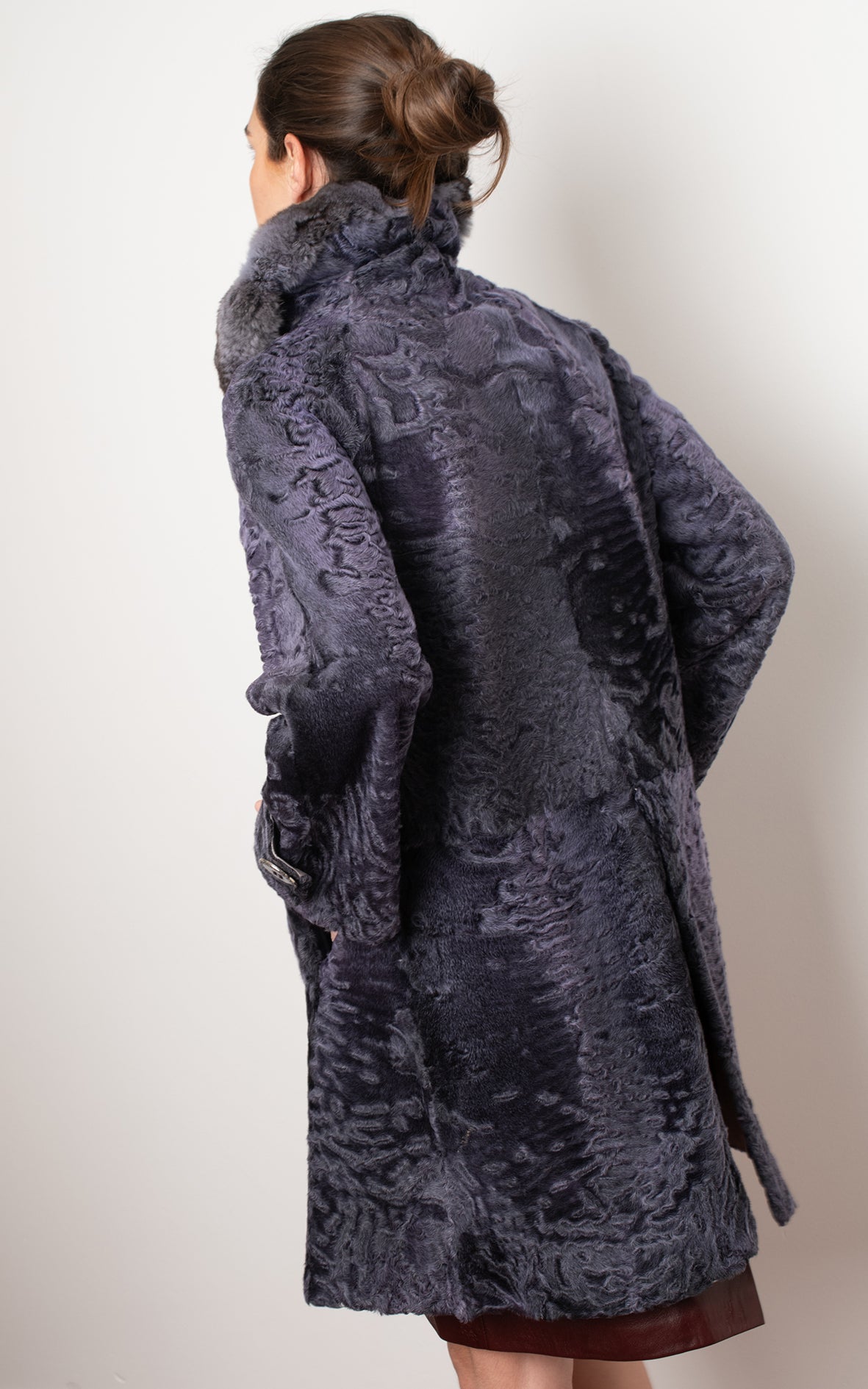Abrigo de astracán con cuello de chinchilla, procedente de la prestigiosa peletería Balta (Burgos). Una pieza de gran calidad artesanal, de tacto sedoso y volumen envolvente, que combina sobriedad y lujo atemporal. El cuello de chinchilla aporta un acabado excepcional y refinado, elevando la silueta con discreta sofisticación. Una prenda clásica, cálida y elegante, propia de la alta peletería española. El precio original superó los 3.000€