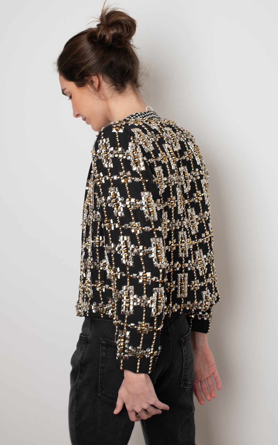 Blazer de Dries Van Noten, vista en la pasarela de París. Es una chaqueta corta en tono oscuro, cubierta por aplicaciones y abalorios metálicos que crean un patrón geométrico muy llamativo. Combina una silueta sencilla con un acabado lleno de textura y brillo, lo que la hace destacar sin necesidad de complicaciones. Una prenda con carácter, moderna y fácil de llevar para transformar cualquier look básico.